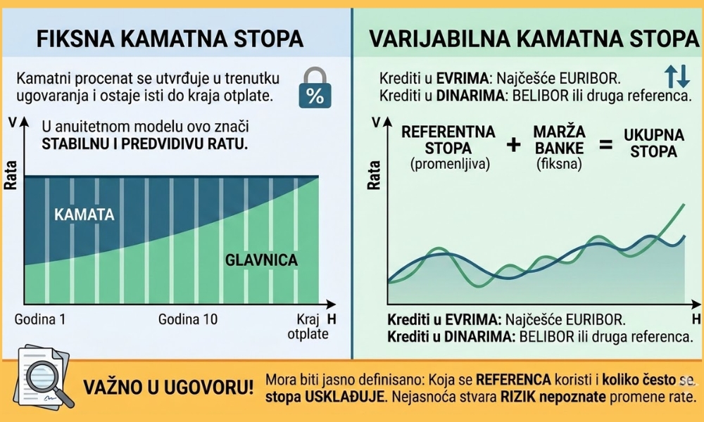 Važno je da u ugovoru bude jasno napisano koja se referenca koristi i koliko često se stopa usklađuje. Kada ta stavka nije jasno definisana, rizik nejasnoće postaje praktičan problem, jer ne znate šta tačno menja vašu ratu.